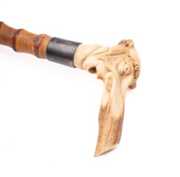 A carved horn and silver mounted walking cane. The handle in the form of a caricature, mounted on a bamboo cane, 90cm high.
