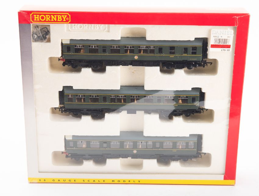 A Hornby OO/HO Great North Eastern Railway Train Pack. Comprising three coaches with green livery, yellow trim and black chassis, boxed.