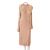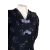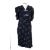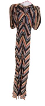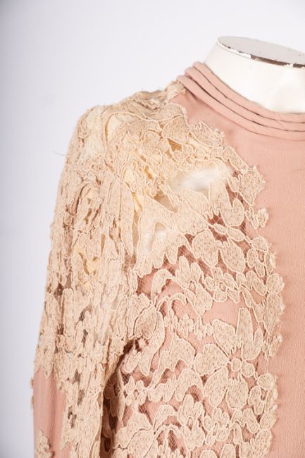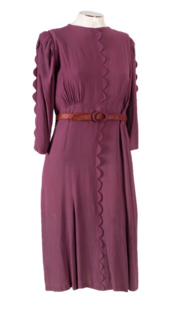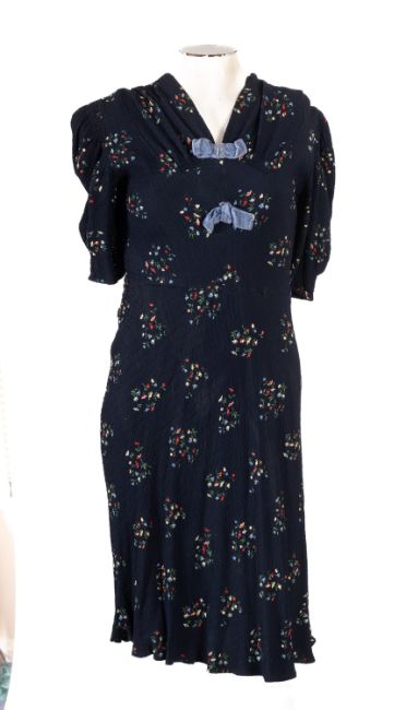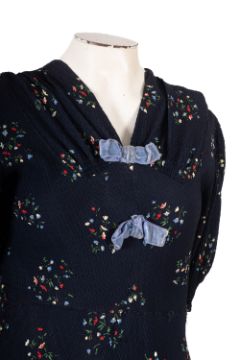A group of four vintage dresses, including a full length multi-coloured stripped dress with puffed short sleeves, and bow detail to the front, together with mid length navy dress with small flower pattern and pale blue velvet bows, a mauve/purple mid length dress with scalloped details to front and sleeves and matching belt, and a blush and white lace panelled mid-length dress with long sleeves and rolled sleeve cuffs and neck line. (4)