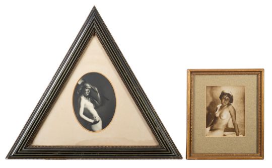 Walden Hammond, photographer (1888-1970).A black and white photograph of a female nude, circa 1920's/30s.oval card mount within a triangular frame, 13.5cm high, together with one other sepia photograph of a nude, unknown photographer, 11.5x9cm, framed and glazed (2)