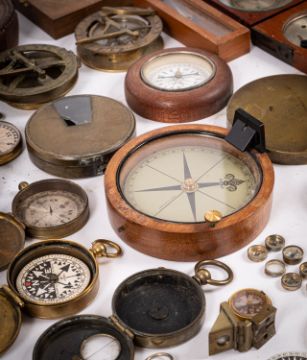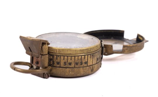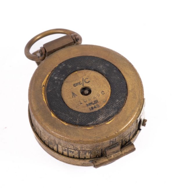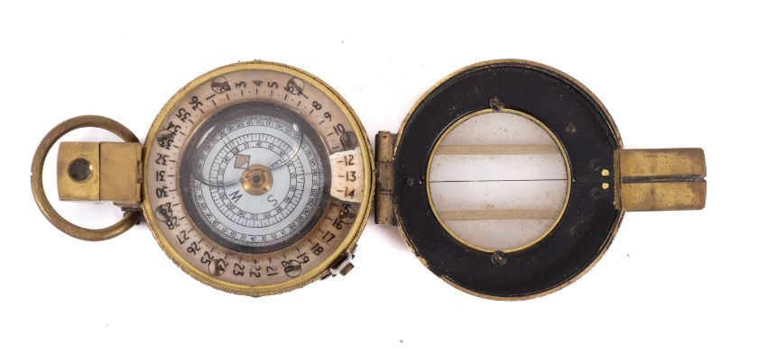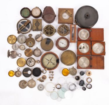 A WWII British military compass. Serial number 10929C, stamped 1943 to the reverse, together with a collection of compass spares including dials, indicators, faces and cases etc.