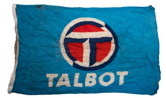 A late 20th century Talbot Motors advertising flag, with central 'Big T' logo on a blue reserve, 118x182cm.