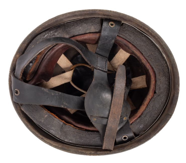 A WWII Royal Army Medical Corps fibre shell paratroopers helmet. Having a leather and canvas lining with leather strap and insignia to the right hand side.