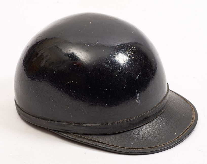 A Stadium 'Vanguard' crash helmet, circa 1950s, the black skull with peak with cork lined interior and bown leather, liner stamped as per title.