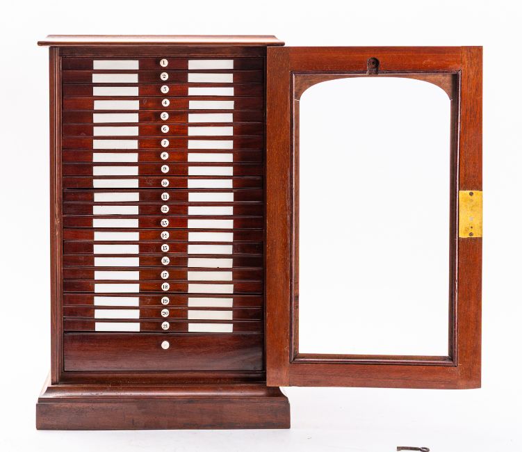 A late 19th Century mahogany specimen cabinet. The top with moulded edges above a glazed panel door opening to 22 drawers with ivory handles, on a plinth base, 44cm high, 29cm wide, 33cm deep. Ivory Exemption Number: 748U6G22