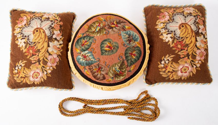 A circular cushion with beaded decoration, 31cm diameter approx, together with two brown floral rectangular cushions, 34cm x 27cm approx, also with two lengths of rope trim. (5)