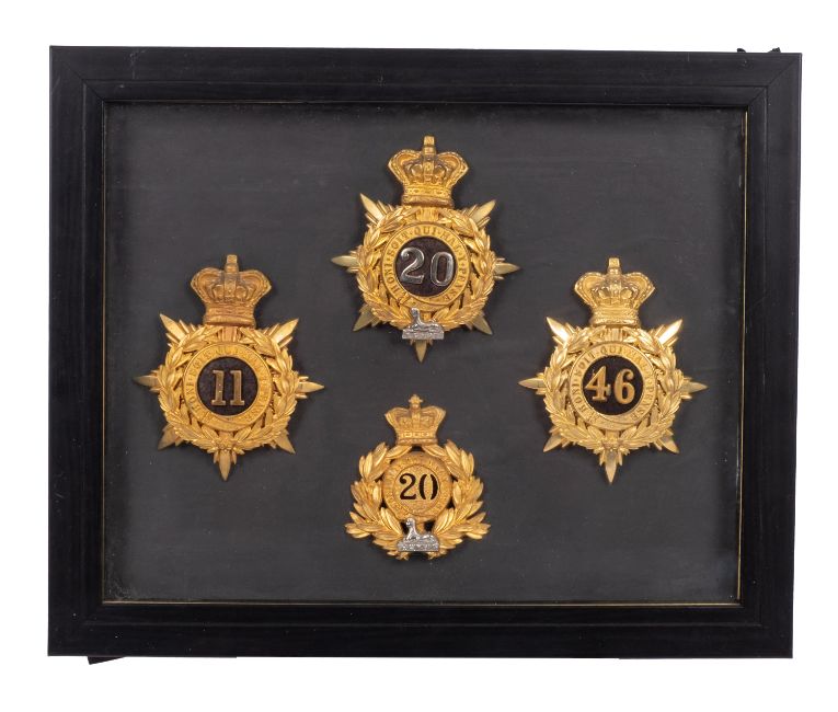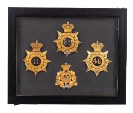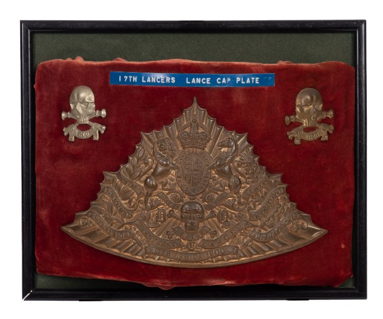 A Reproduction 17th Lancers cap plate. Together with four other reproduction regimental badges framed and glazed.