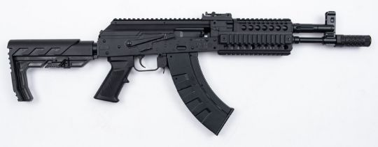 A Crossman AK1 semi automatic CO2 powered air rifle. Serial number 21M176233, BB calibre (4.5mm), having a 13.5' barrel on a synthetic adjustable stock, with magazine.