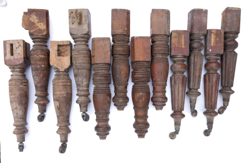 A set of four knop turned and reeded table legs. To ceramic castors, 70cm high, together with two similar sets of legs.