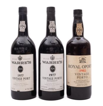 Two bottles of Warres 1977 vintage port. Bottled in 1979, together with a bottle of Royal Oporto 1985 vintage port, all 75cl and 21% vol, unboxed. (3)