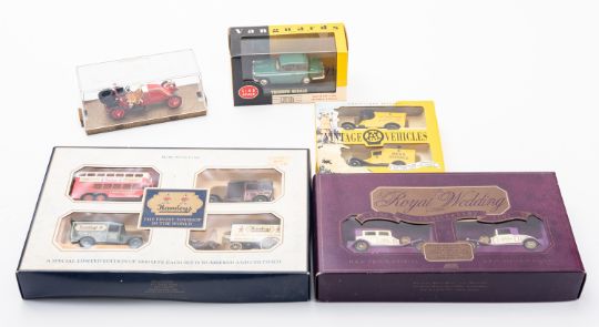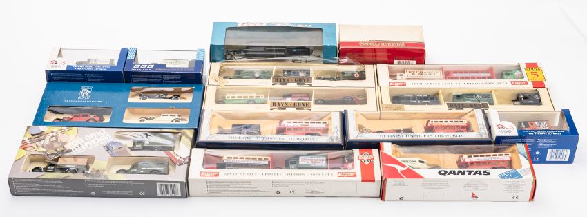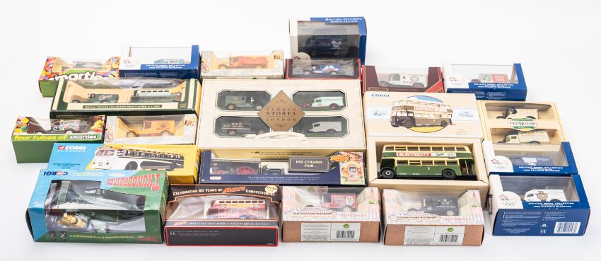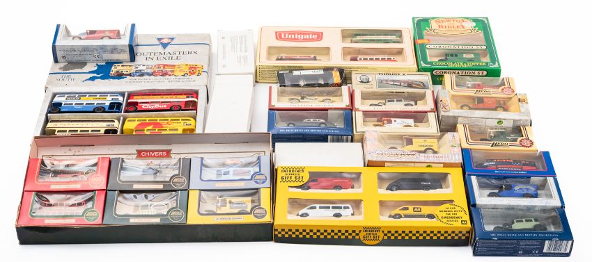 A collection of Lledo and Corgi diecast vehicles. Including Thunderbirds, trucks, buses and cars etc, all boxed.