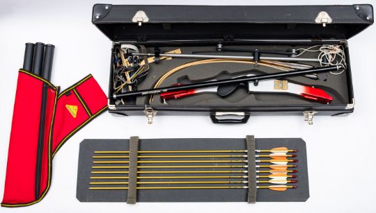 A Samick Progress I left handed recurve bow. With Arten Olympic sight, 8 x Easton E75 alloy arrow, bow stand, case, quiver etc.