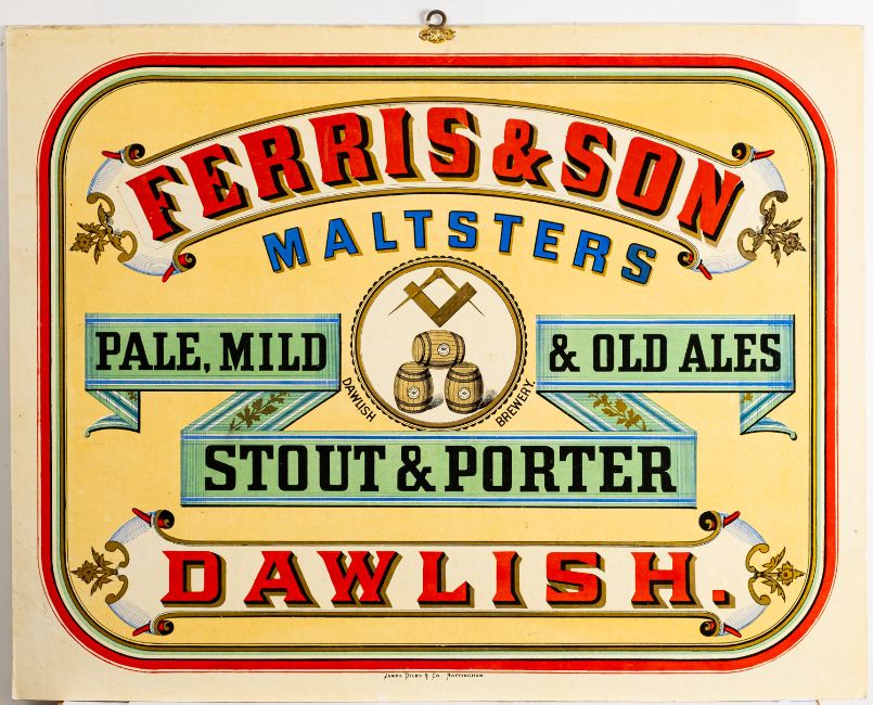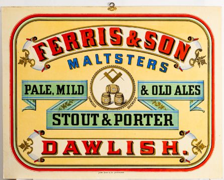 A pair of early 20th century painted and varnished advertising panels for "Ferris & Son Maltsters... Dawlish, 44.8x57cm.
