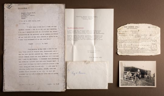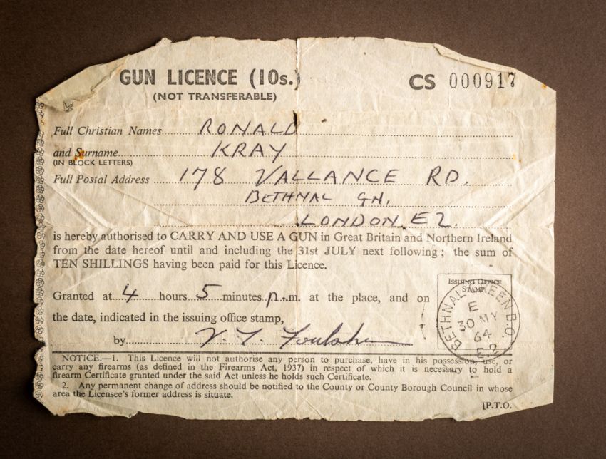 Ronald Kray (1933 - 1995). A gun licence, serial number 00917 issued by Bethnal Green Borough Office dated 30 May 1964. To Ronald Kray at 178 Vallance Road, Bethnal green, London E2. Dated stamped as per title. Together with a single page typed letter of reference for 'Mr Reginald Kray' from 'H. Granshaw' dated 19 October 1964. Alongside black and white photograph of Ronnie Kray carrying a calf (undated) and a facsimile copy of Ronald Harts Statement to The Sunday Times 29th May , 1970.*Provenance formerly the property of Charlie Kray then by direct family descent.