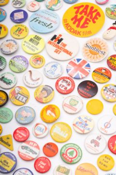 A collection of 1950s and later badges. Including Dan Dare, Stop Stanstead, Matchbox Collector, Ban the Bomb and many more.