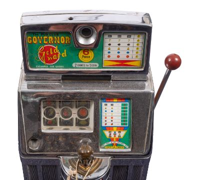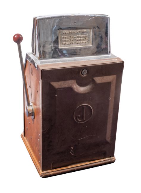 A Jennings & Company Governor' Indianhead' one-arm bandit slot machine, Two plays for 6d, the plated case with glazed title display 'The Pub Club Governor Gold Award' over three reel play and brass Native American bust to demi-line front pay out well, mounted on a wooden base, 70cm high , 39cm wide, (with key to case, working at time of cataloguing)