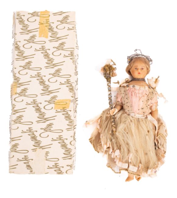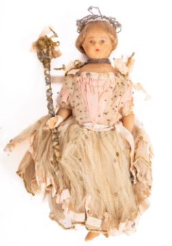 A 19th Century wax head doll, having a painted face with applied blonde wig wearing a beaded tiara and lace dress, 26cm tall.