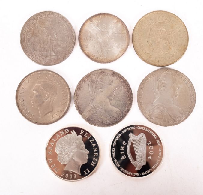Two Maria Theresa Thalor coins. Together with a 1910 Britannia trade dollar, New Zealand 2003 silver dollar, 2004 Irish 10 Euro, a 1937 Crown and a 1985 Mexican coin.