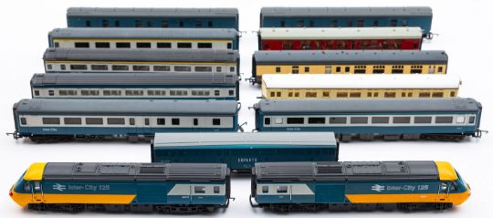 A Hornby OO/HO BR Intercity 125 three car unit, DCC fitted. Together with a collection of various passenger coaches in various liveries, all unboxed.