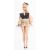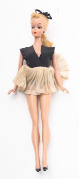 A German 'Bild Lilli' fashion doll, circa 1950s, blonde hair over painted face with arched eyebrows, black and white painted eyes and red painted lips, moulded earrings to ears, over a jointed body with black painted moulded shoes, dressed in a black cotton and lace top with matching shorts, the top with press stud stamped PRYM, 30cm high.