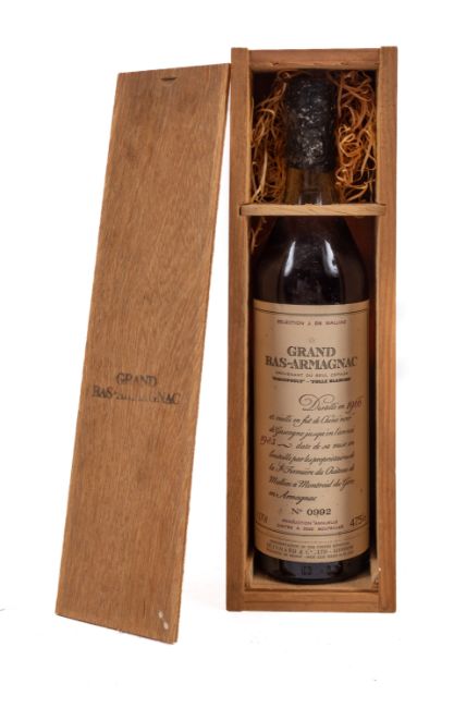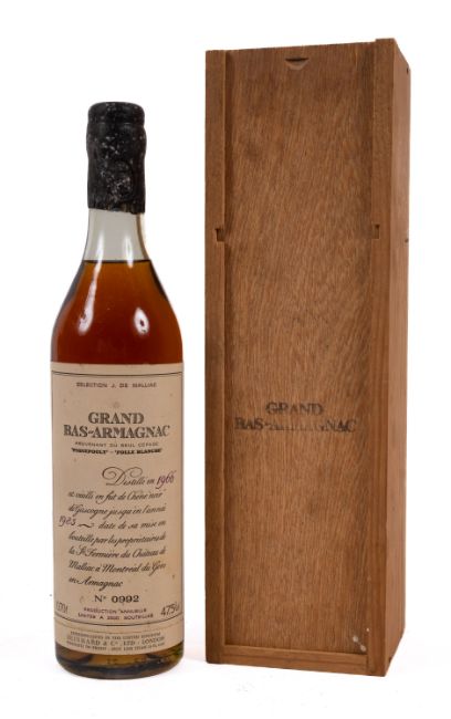 A bottle of 1966 Grand Bas-Armagnac. Distilled in 1966 and bottled in 1985, bottle number 0992, in wooden box, 70cl, 47.5% vol.