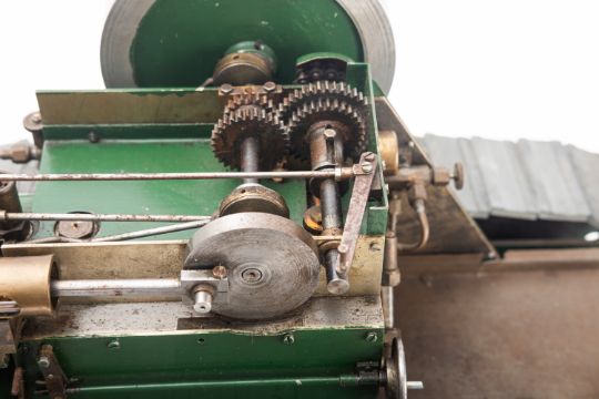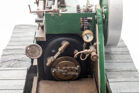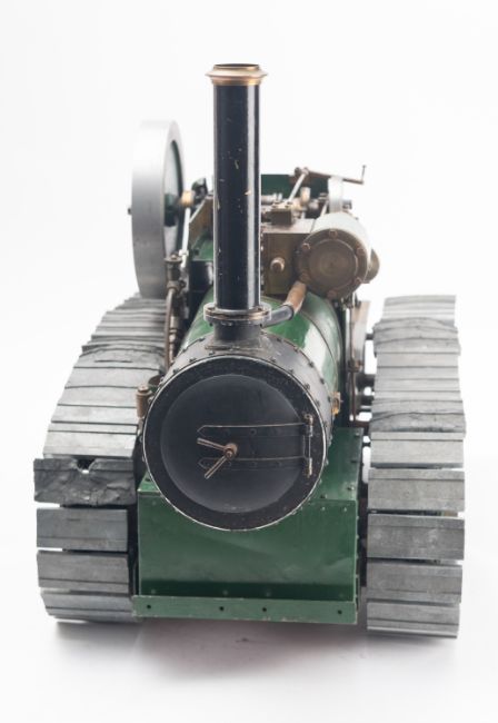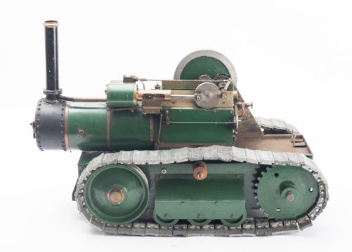A one inch scale live steam model of a steam-powered crawler, based on the Fowler 'Snaketrac' Roadless Tractor, 5 inch flywheel, single piston with gears and steering arm, green painted boiler with brass band, black chimney and 2 1/4 inch diecast sectional track 38cm high, 56cm long