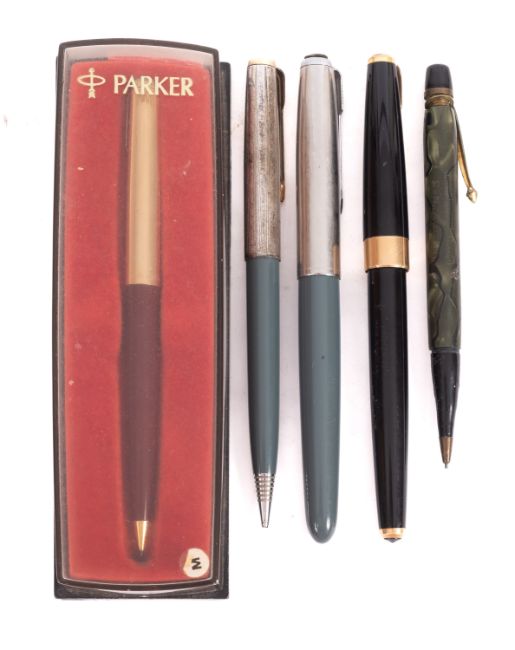 Two Parker fountain pens, two Parker propelling pencils and a Conway Stewart 'Nippy' propelling pencil.