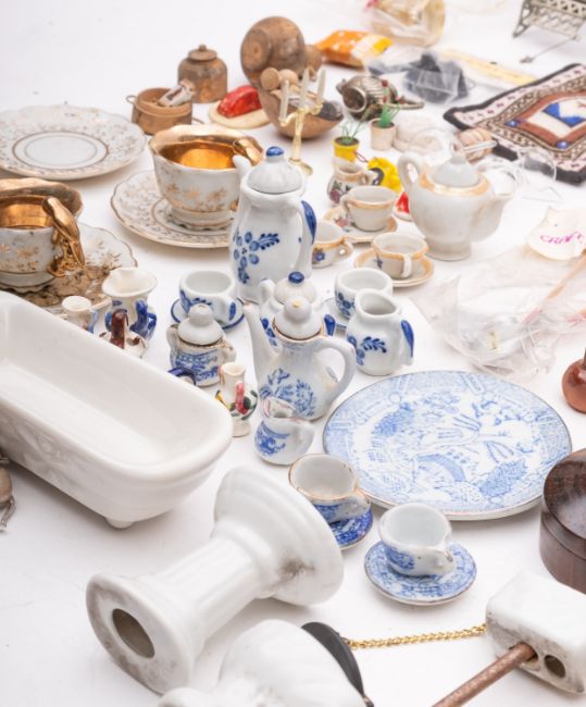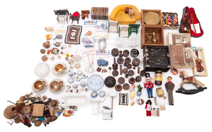 A collection of dolls house furniture and accessories. Including a Chinese inlaid chest of drawers, a wooden library suite, a porcelain bathroom suite and conservatory furniture, together with a range of kitchen accessories including tea sets, pots and pans, musical instruments and sewing machines etc.