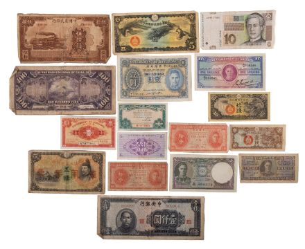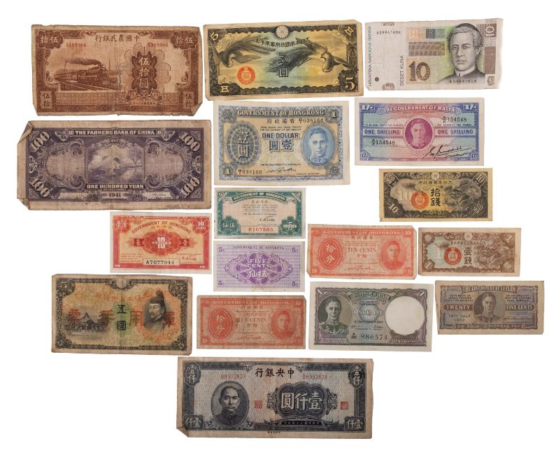 A collection of World banknotes. Comprising Chinese, Japanese, Hong Kong one dollar etc.