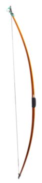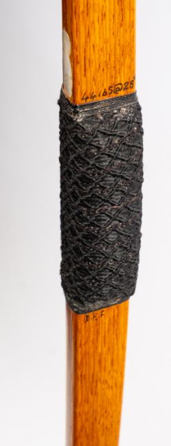 A 20th Century stained yew wood and mother of pearl inlaid longbow. Having horn nocks and cord grip, drawing 44lbs of force at 28', 6'3" long.