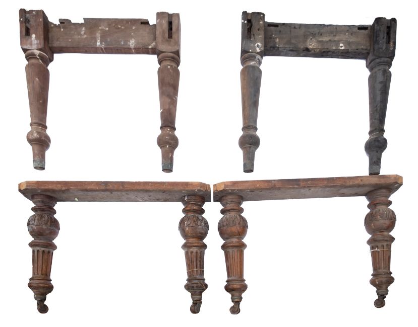A set of mahogany trestle table legs. Of knop turned form with foliate carved knees to tapering reeded legs and ceramic castors, 64cm high, 87cm wide, together with a later set of trestle table legs.