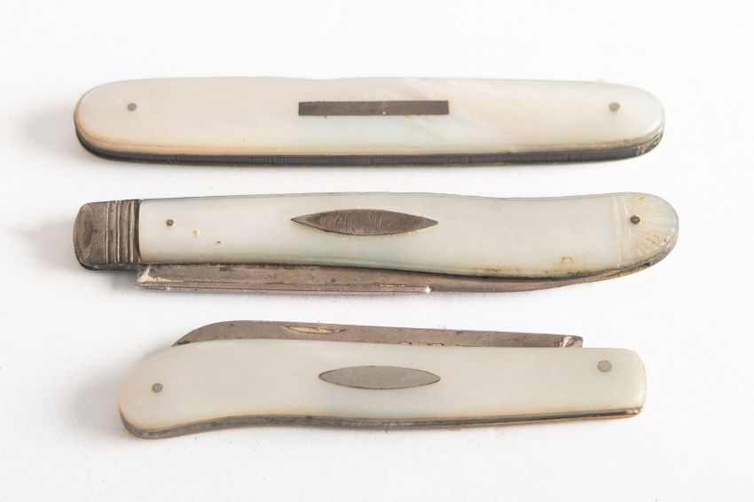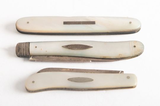 Three silver and mother of pearl handled fruit knives. Various makers and dates, largest 9cm long.