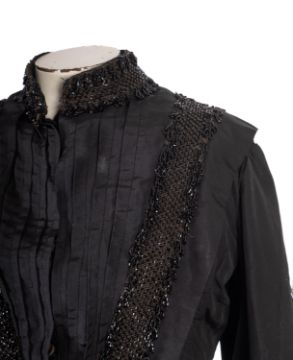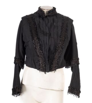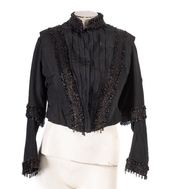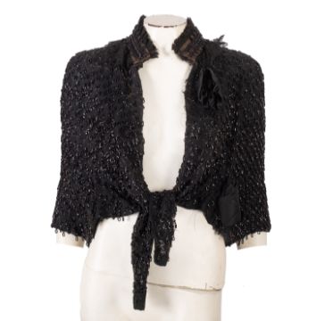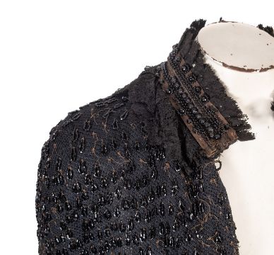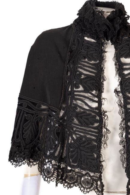 A group of three Victorian style black lace and beaded ladies Mourning Capes, together with a modern black lace cardigan/jacket with black ribbon bow fastenings to the front. (4)