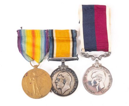A WWI medal group awarded to 90936 Gnr A Smith R.A. Together with a KGVI RAF long service and good conduct medal awarded to 349386 F/Sgt AG Mugford RAF in original box of issue, plus an Army Services white metal pocketwatch and a pair of Optimax 8x30 field binoculars. (4)
