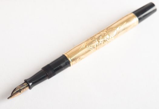 A gold plated Waterman 'Ideal' fountain pen. Having scrolling foliate decoration, in original box.