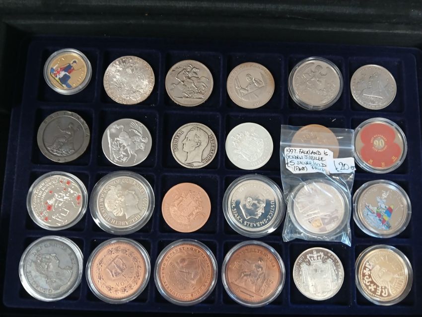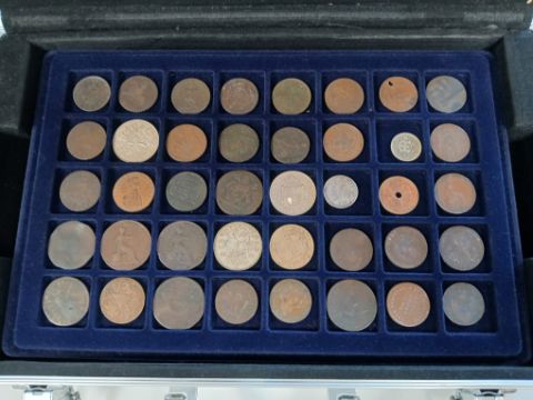 A World coin collection in metal coin briefcase including some silver, 1797 Cartwheel 2d, some fantasy coins, etc.