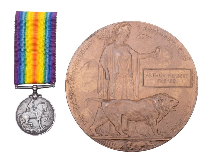 A WWI death plaque commemorating Arthur Herbert Sheard. Together with a war medal and photographs.