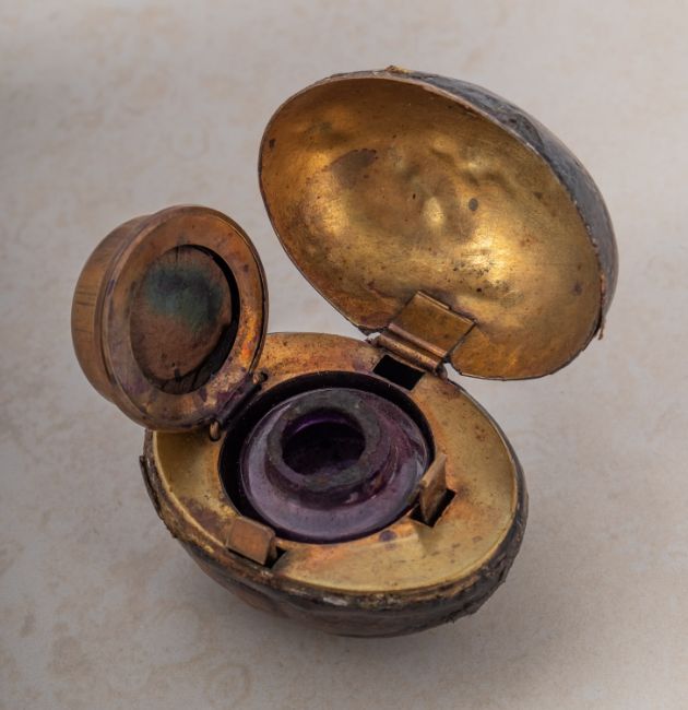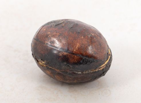 An early 20th century novelty travelling inkwell in the form of a rugby ball, the leather covered case with simulated stitching to top , enclosing a gilt lined interior with glass inkwell, 6cm long