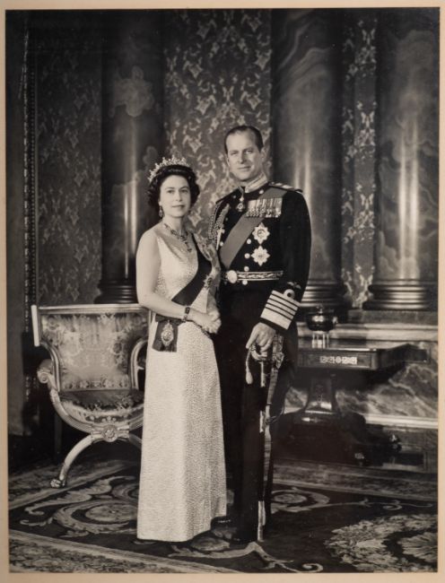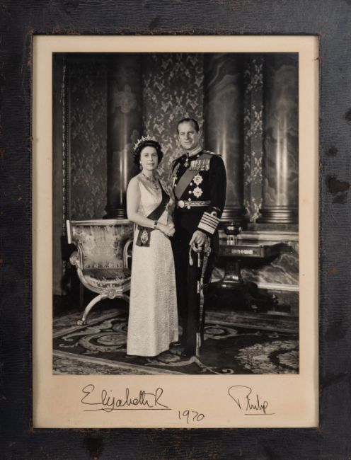 ELIZABETH II, PHILIP - Portrait photograph signed to mount, 'Elizabeth R', 'Philip', 1970, photographer Anthony Buckley, framed and glazed (leather frame by H.H.Plante, London), image 23cm x 17.5cm.