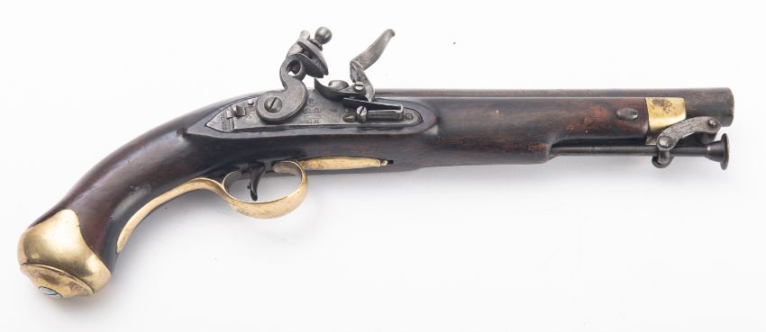 A George IIII flintlock pistol, maker Tower of London, the plain 9 inch barrel with proof marks to breech, stirrupped ramrod under, the sidelock action with safety stamped 'Tower' and with crown and 'GR' cipher, brass trigger guard and fittings, numbered '25' to lock plate, on a walnut stock, 39cm long