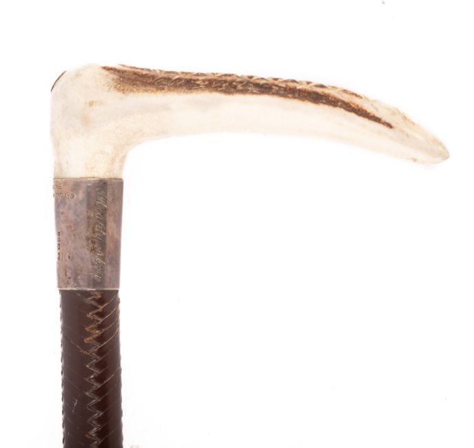 A silver mounted Swaine riding crop, having a carved antler handle and leather shaft, maker's plaque to handle, 67cm long.