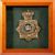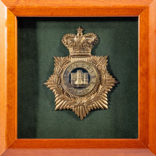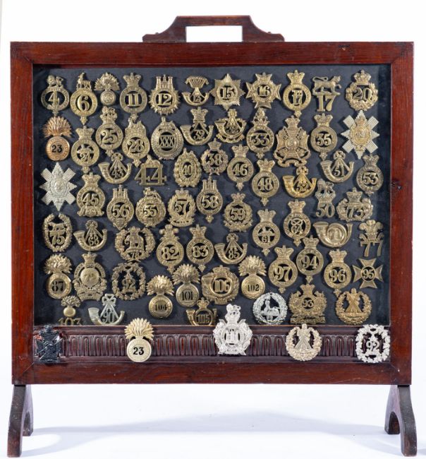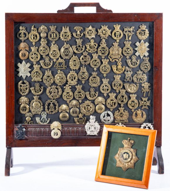 A brass Devonshire Regimental badge. Framed and glazed, together with a collection of various regimental badges mounted within a fire screen, 67cm high, 62cm wide. (2)