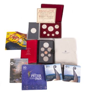 Two Royal Mint 2017 silver coins. Together with USA Eisenhouer proof dollar, 1978 Canada set of seven coins and an Edward VIII centenary pattern set, boxed etc.