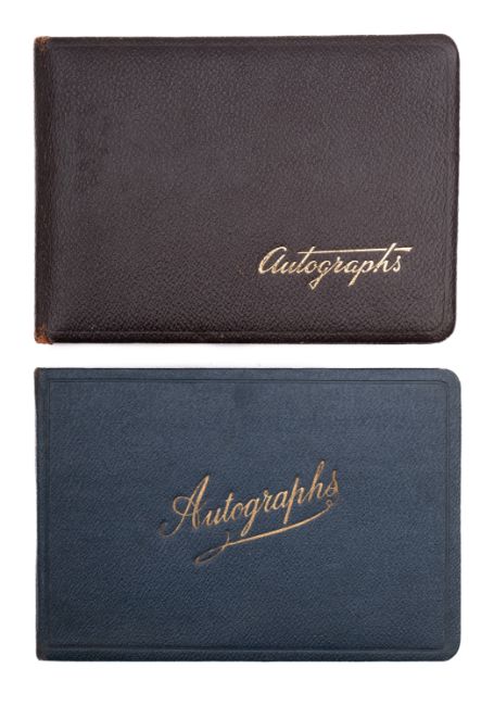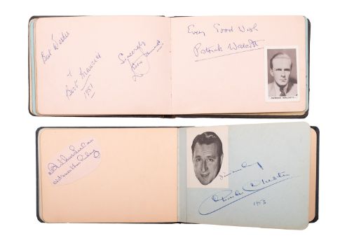 Two 20th Century autograph albums. Well filled with signatures from Sandy Powell, Ted Heath, George Formby, Peter Sinclair and Jerry Hall etc.