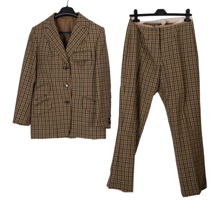 Three vintage two piece jacket sets, including a grey 'Eastex' lady's jacket with matching skirt, size 14, together with a lady's brown jacket and matching trousers, and a green checked tweed jacket and trouser set. (6)
