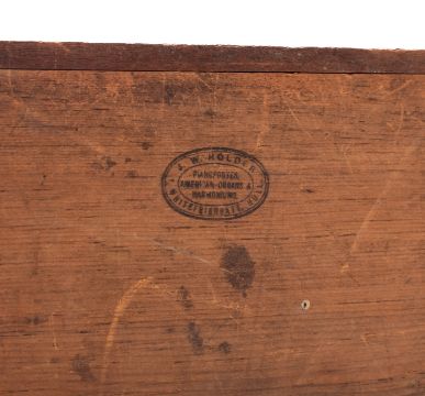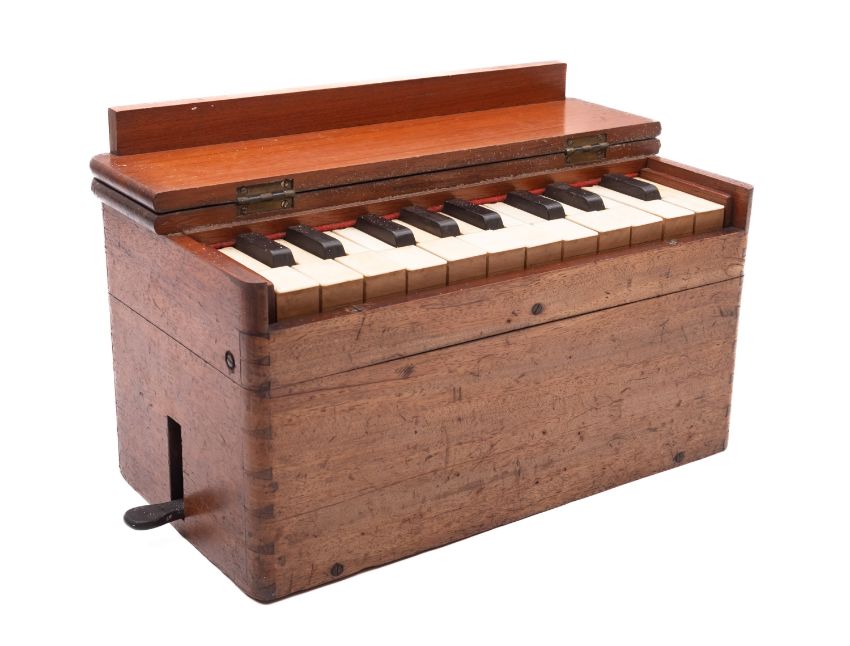 A JW Holder box Harmonium. Mahogany cased with a hinged top opening to 12 ivory keys with internal bellows and lever to the left side, makers stamp to the base, 17cm high, 34cm wide, 18cm deep. Ivory Exemption: VW1AZTZN