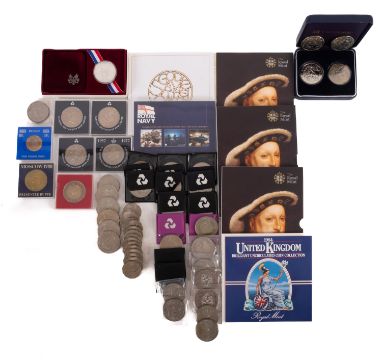 Four Trafalgar £5 coins, together with a 1984 USA Olympic silver dollar, six Queen's 70th birthday £5 coins, a 2003 £5 coin, three packaged 2009 £5 coins, three 1953 crowns, a 1984 UK coin set, fifteen 1970 Australia 'Cook' 50 cents, halfcrowns including a 1944, two 1953 'plastic' sets, etc.