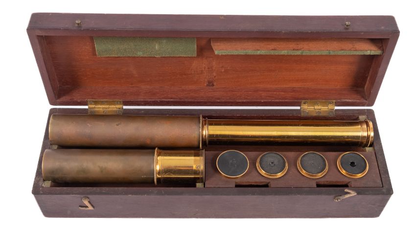 An early 20th Century brass telescope. Having two interchangeable heads and a range of lenses, in fitted box, unsigned.