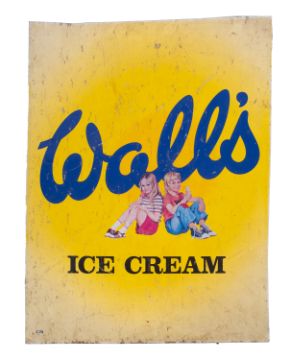 A Walls Ice Cream metal advertising sign. Of rectangular form showing two children eating ice cream, blue and black lettering on a yellow ground, 61cm high, 46cm wide.
