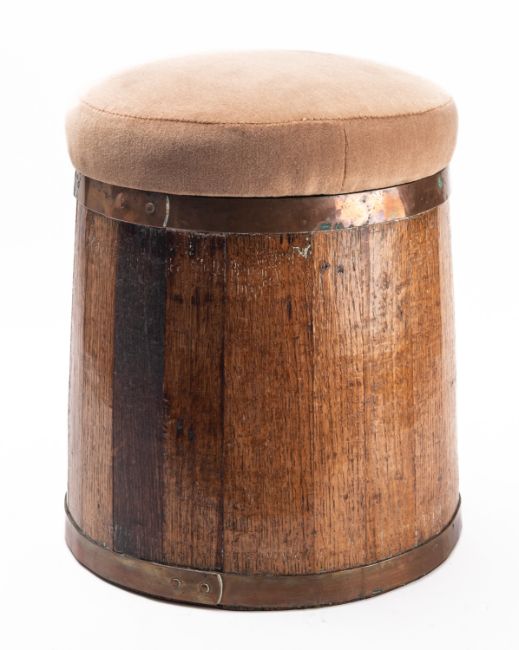 A 20th Century oak barrel stool. Having an upholstered top above a metal bound barrel with vacant interior.